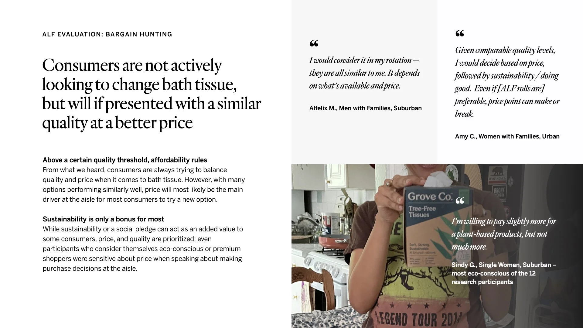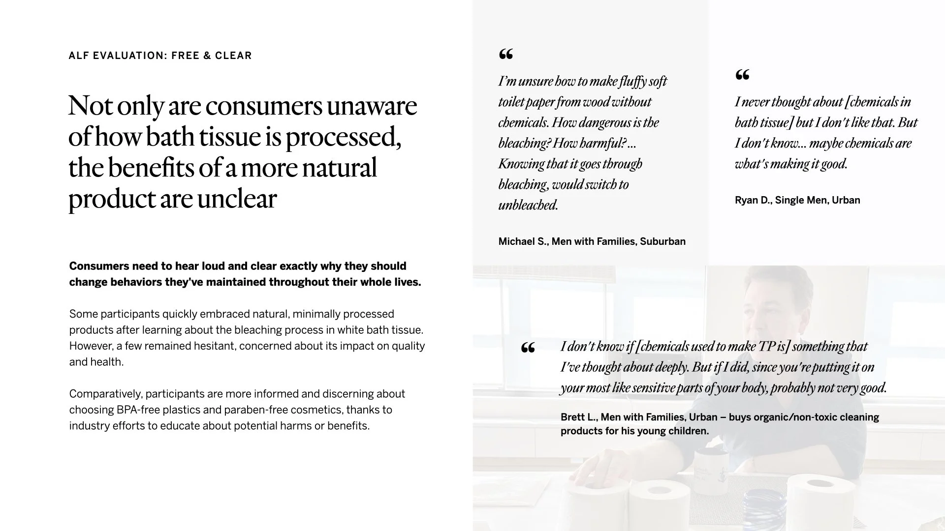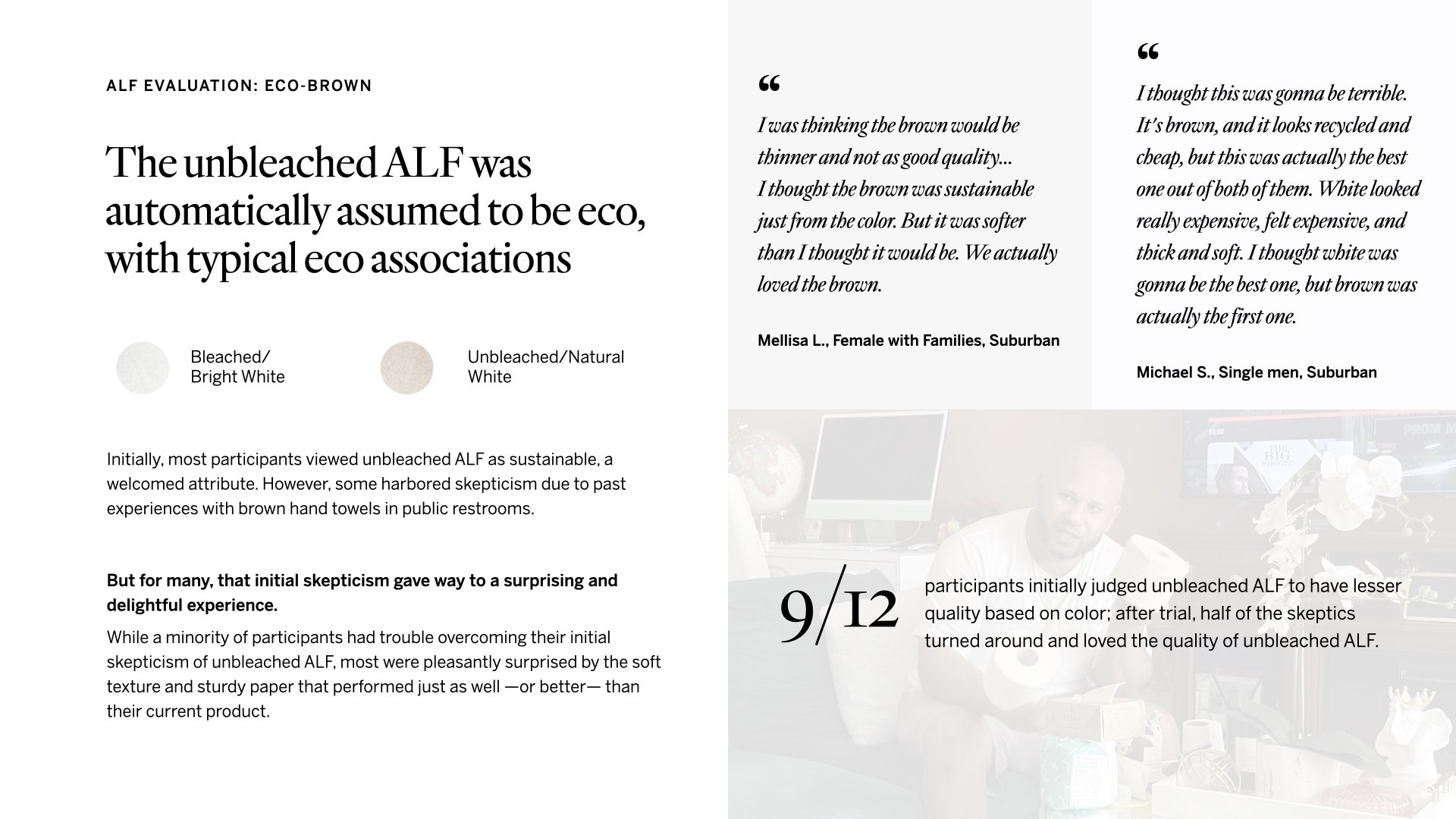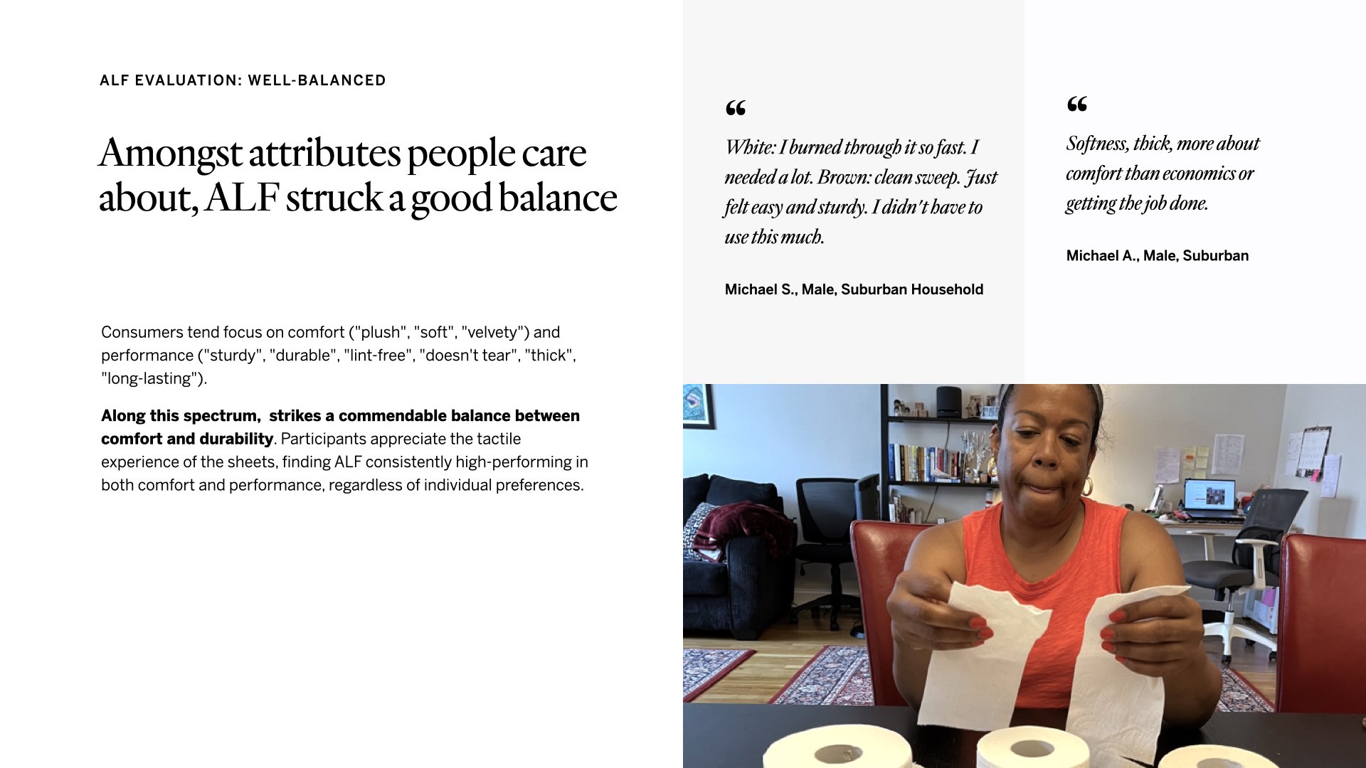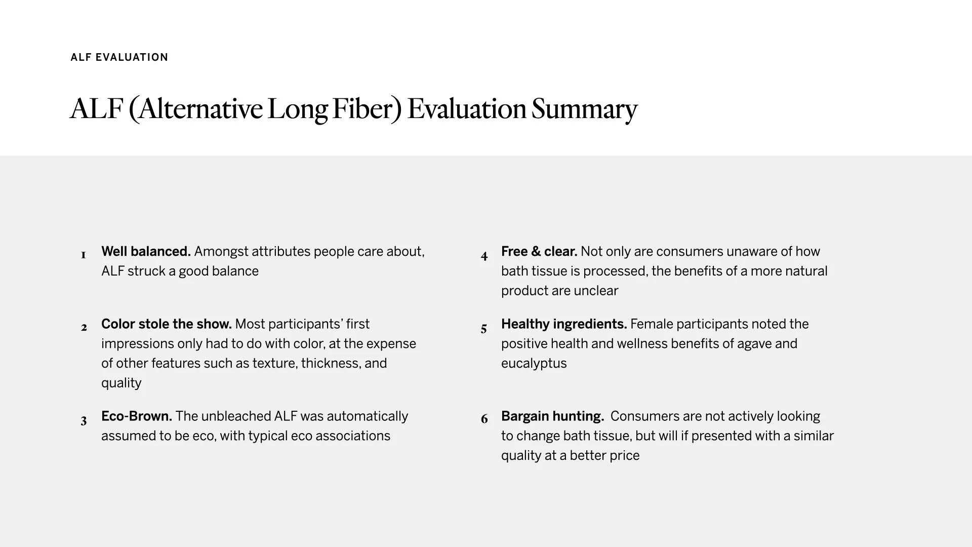 We received samples of the new bath tissue product with the special ingredient, shorthanded as ALF (alternative long fiber). We sent out these samples to consumers for experience research.